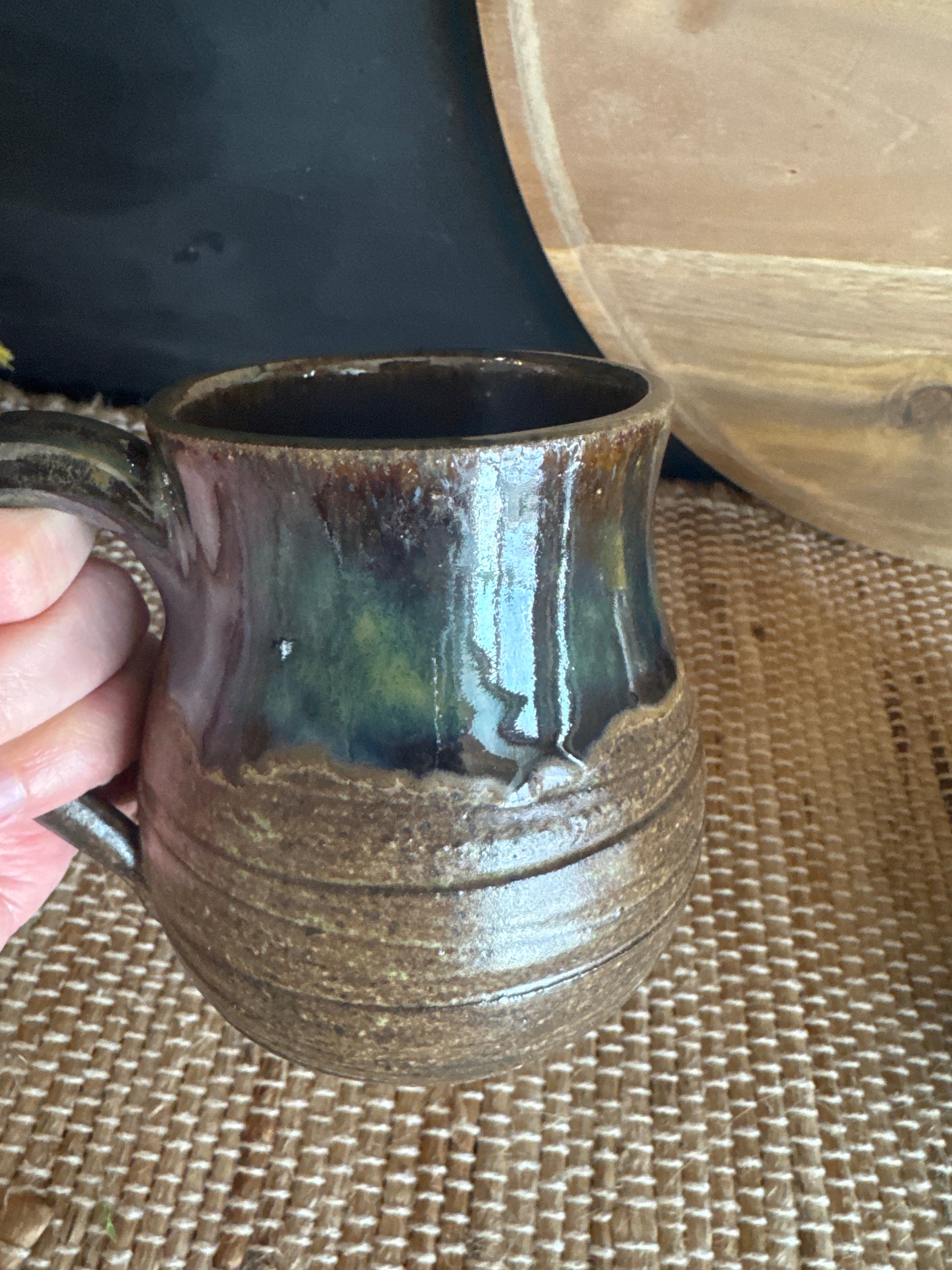 This wheel thrown mug is made on a speckled clay. It has a brown speckled look, with texture lines around the belly. The top glaze is green with deep purple. Very beautiful rustic looking mug! The clay is a little rougher texture, so the bottom has been sanded smooth where it sits on the table!