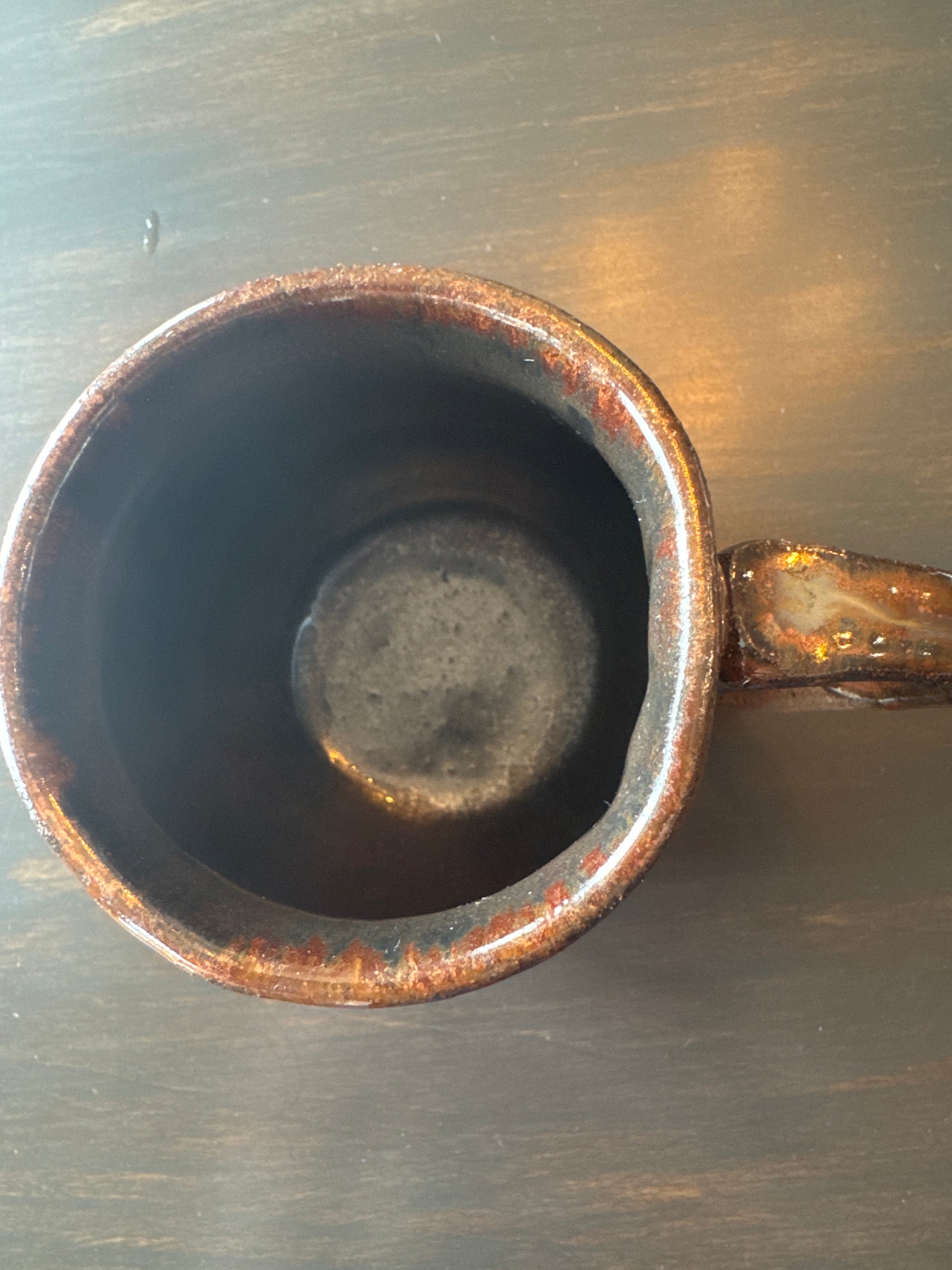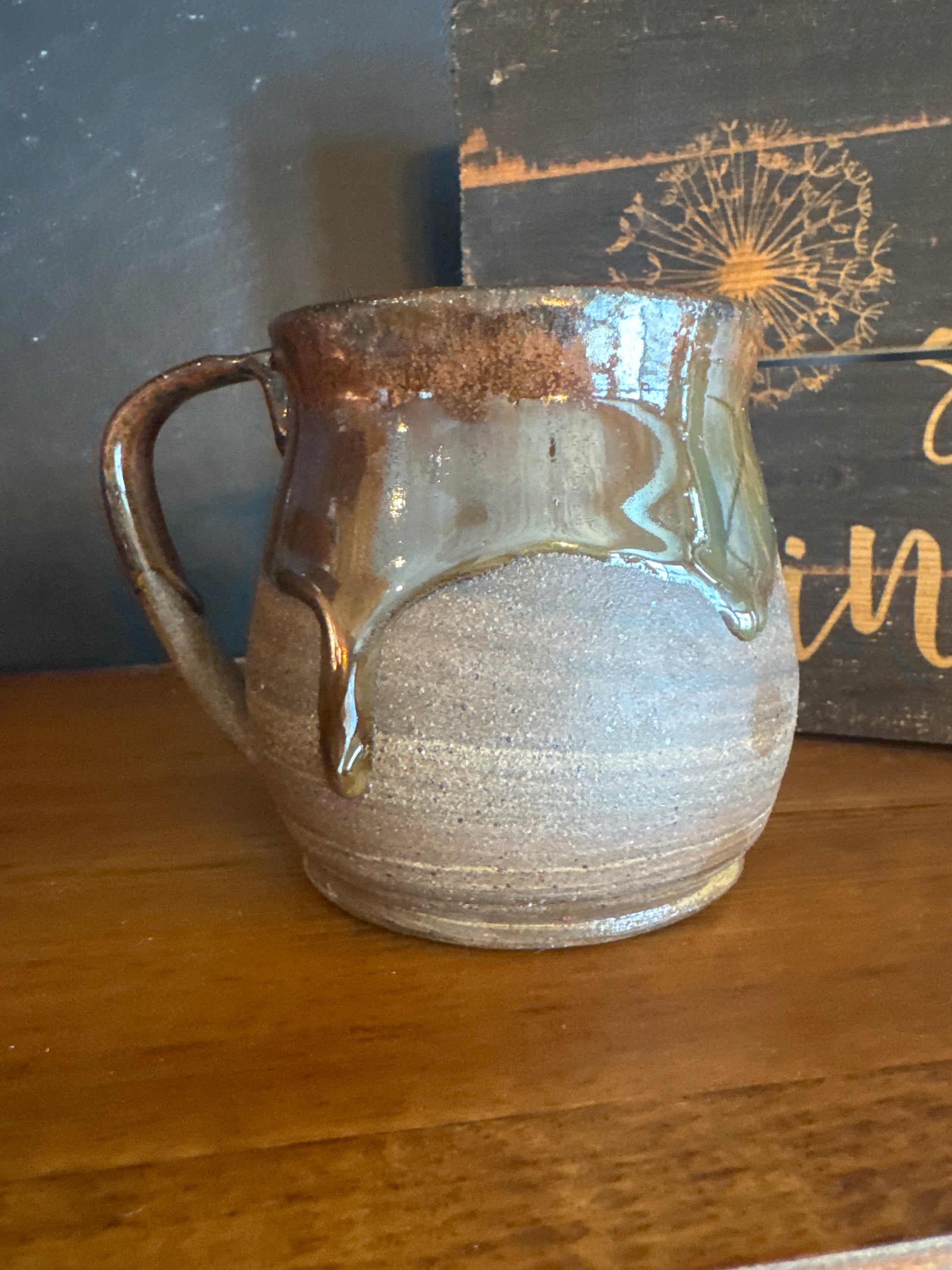 This mug is made from a couple darker colored clays marbled together. I left it unglazed on the bottom to show the marbled look. The top is glazed in a coppery Brown glaze that is dripping down the sides. The mug is not perfectly round as you can see from the pictures which I think adds to the appeal. It holds 10 ounces.