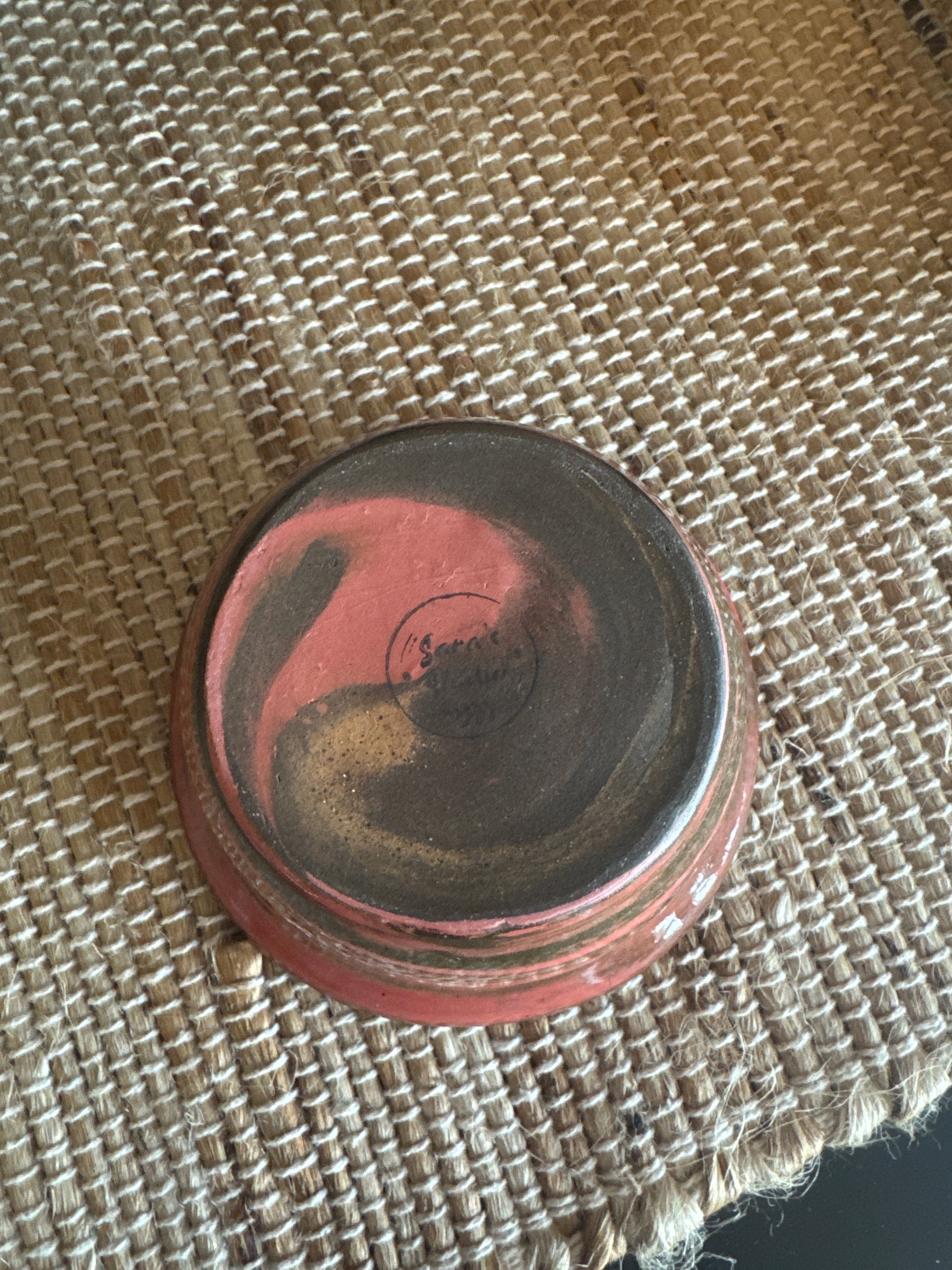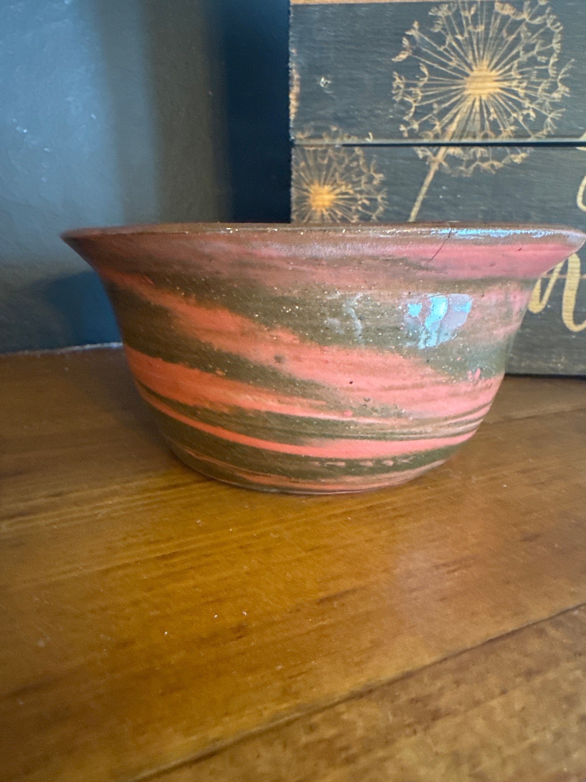 This little bowl is very unique. It is marbled with a dark colored clay, along with a stained dark pink/red clay. It is glazed with a clear glaze to show the marbleizing through. It is a small sized bowl - smaller than a cereal bowl. Holds 10 ounces of liquid for reference.